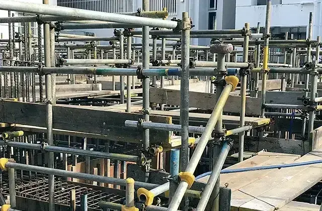 単管を組み立ててつくる、高度な技術が必要な足場です。形状が柔軟なため、狭小地などにも適しています。
